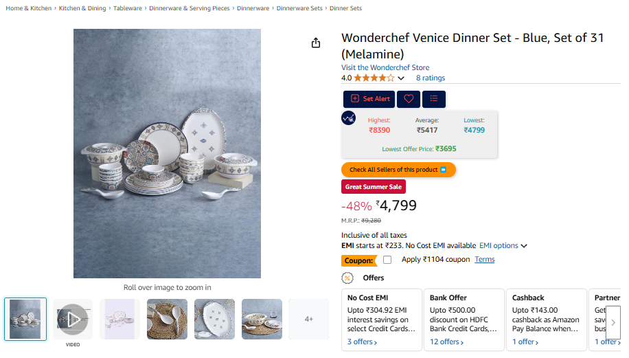 Wonderchef Venice Dinner Set - Blue, Set of 31 (Melamine).