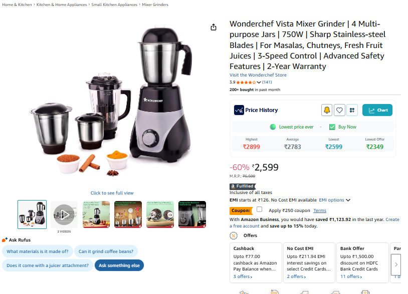 Wonderchef Vista Mixer Grinder | 4 Multi-purpose Jars | 750W | Sharp Stainless-steel Blades | For Masalas, Chutneys, Fresh Fruit Juices | 3-Speed Control | Advanced Safety Features | 2-Year Warranty