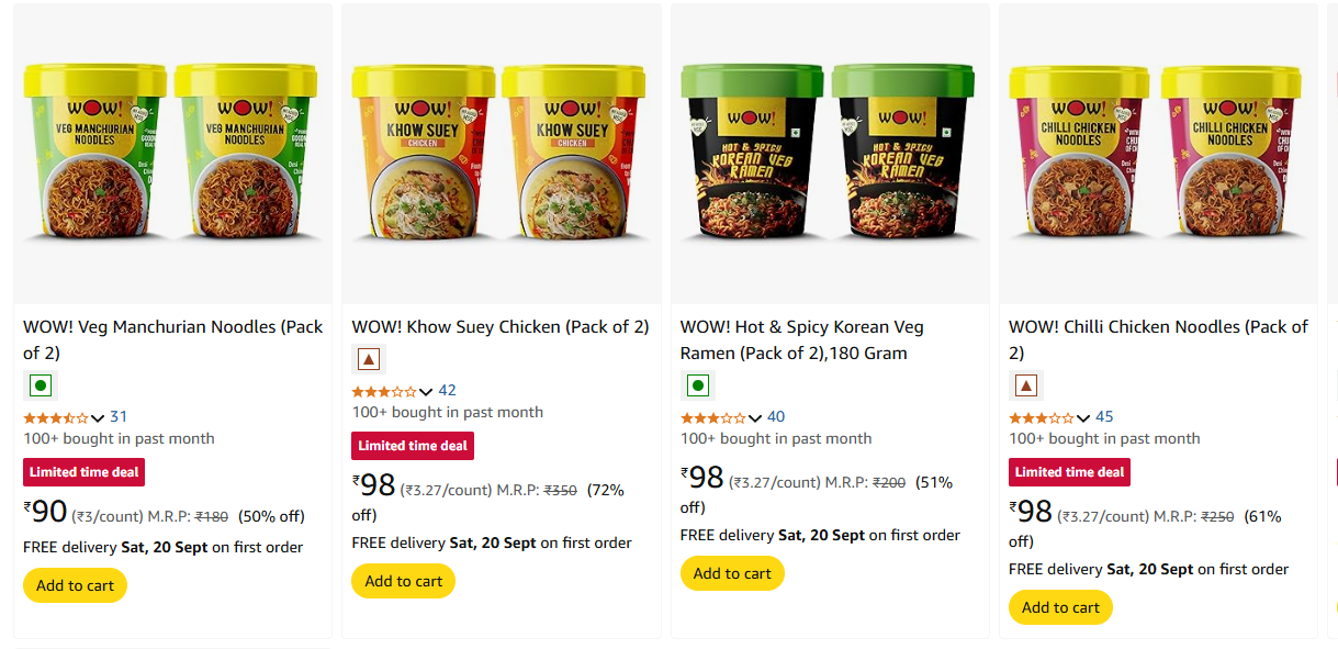 WOW 2 Packs Noodles From ₹90 is available @ Amazon