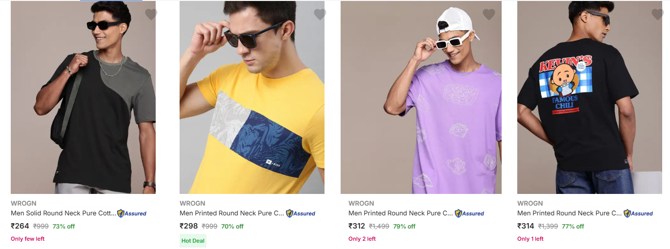 Wrogn Men's T-Shirts upto 79% Discount is available on Flipkart.