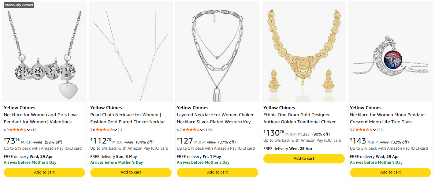Yellow Chimes Jewellery starting at ₹73 is available on Amazon.