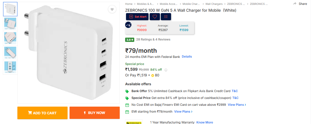ZEBRONICS 100 W GaN 5 A Wall Charger for Mobile (White).