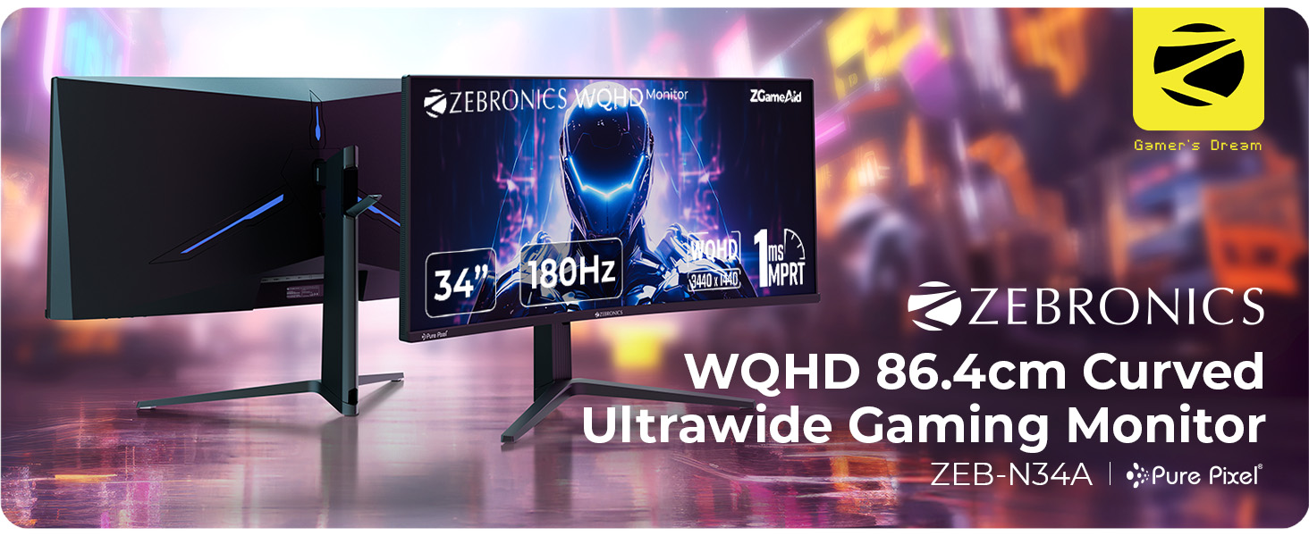 ZEBRONICS New Launch N34A 34\'(86.4 cm) 1500R Curved Ultrawide Gaming Monitor, WQHD 3440x1440, 350Nits, 180Hz, 1ms MPRT, HDR10, 99% sRGB | 92% DCI-P3, Adaptive Sync, 2 x DP | 2 x HDMI | 1 x 3.5mm.
