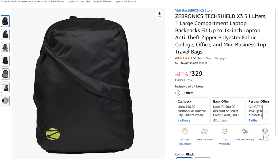 ZEBRONICS TECHSHIELD X3 31 Liters, 1 Large Compartment Laptop Backpacks Fit Up to 14-inch Laptop Anti-Theft Zipper Polyester Fabric College, Office, and Mini Business Trip Travel Bags.