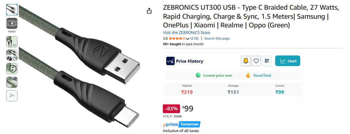 ZEBRONICS UT300 USB - Type C Braided Cable, 27 Watts, Rapid Charging, Charge & Sync, 1.5 Meters| Samsung | OnePlus | Xiaomi | Realme | Oppo (Green) is available on Amazon.
